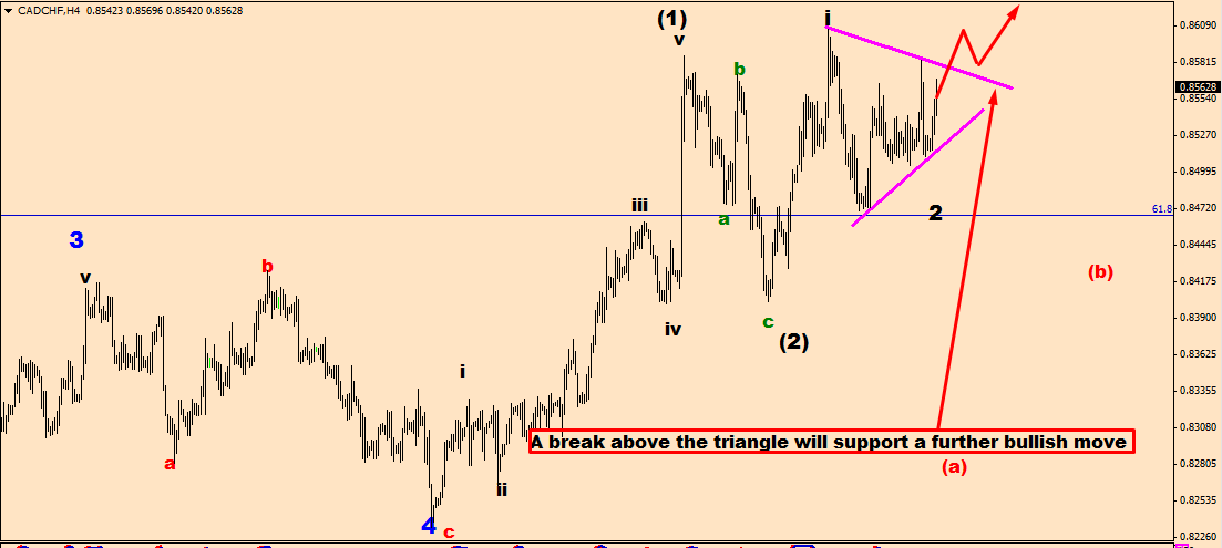 If Usdcad breaks the triangle downside, it's either we have a wave 3 or c which could end at 1.1000 ( 161.8 % extension of a from b and 61.8% retracement of the wave 5 that I discussed on 5th October
